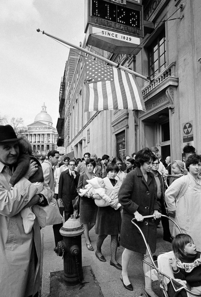 People are seen walking past a Fallout Shelter sign at 3 Park Street in Boston, just down from the Massachusetts State House, on April 5, 1968. These people had been engaged in demonstrations that took place after the assassination of Dr. Martin Luther King, Jr in Memphis, Tennessee the day prior.