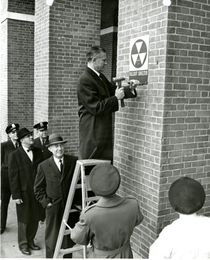 Up until recently, I only knew of one photo of Governor Volpe hanging a Fallout Shelter sign (the first in Massachusetts) at the Massachusetts State House on November 5, 1962.